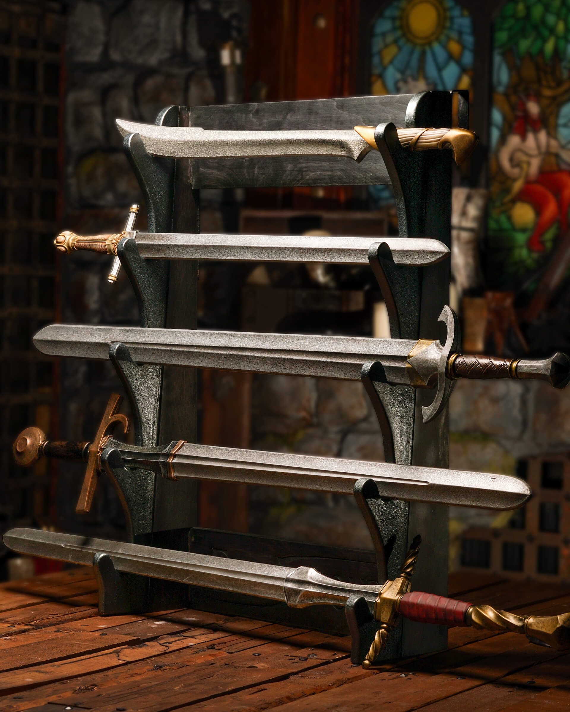 Our specially designed wooden racks for swords and polearms bring a distinct medieval fantasy atmosphere to your store. More than just storage, these displays elevate product presentation and help customers immediately understand the value and appeal of the equipment - allowing the products to effectively sell themselves.